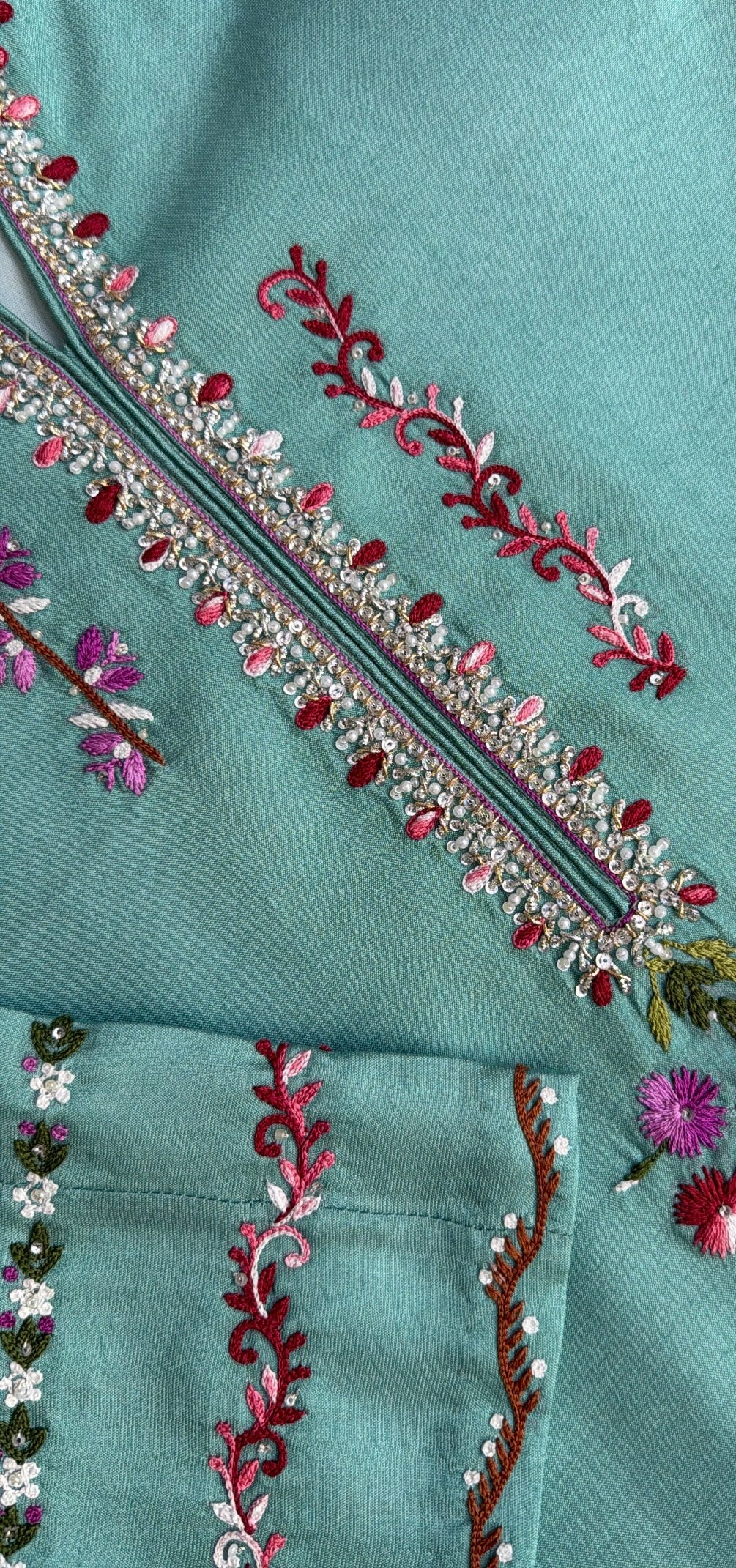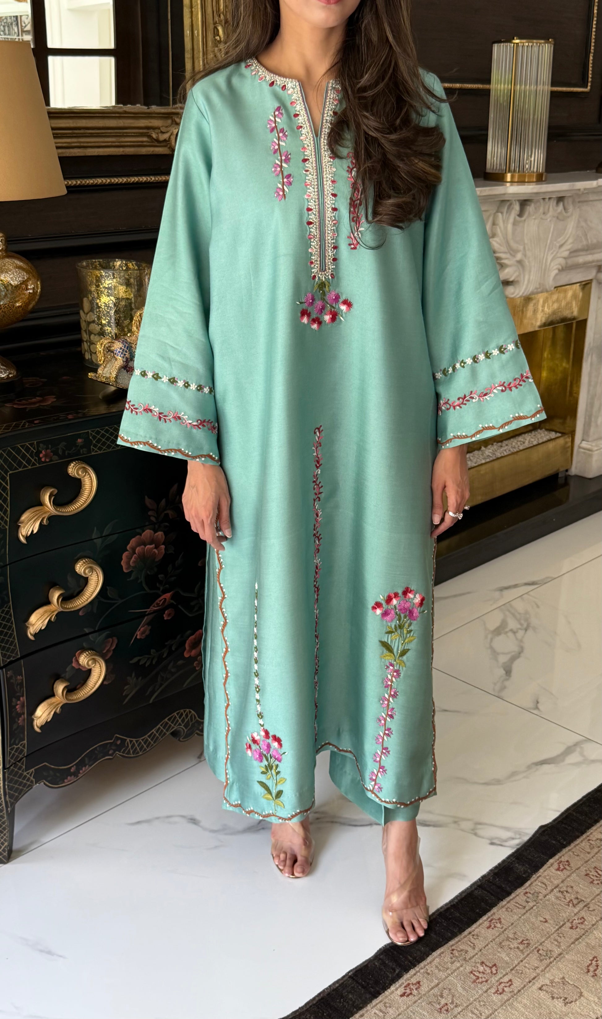 An aqua blue cotton net kurta hand embroidered in colourful hues and enhanced with Swarovski and sequins detailed neckline, paired with a coral organza hand embroidered duppata finished with tassles.