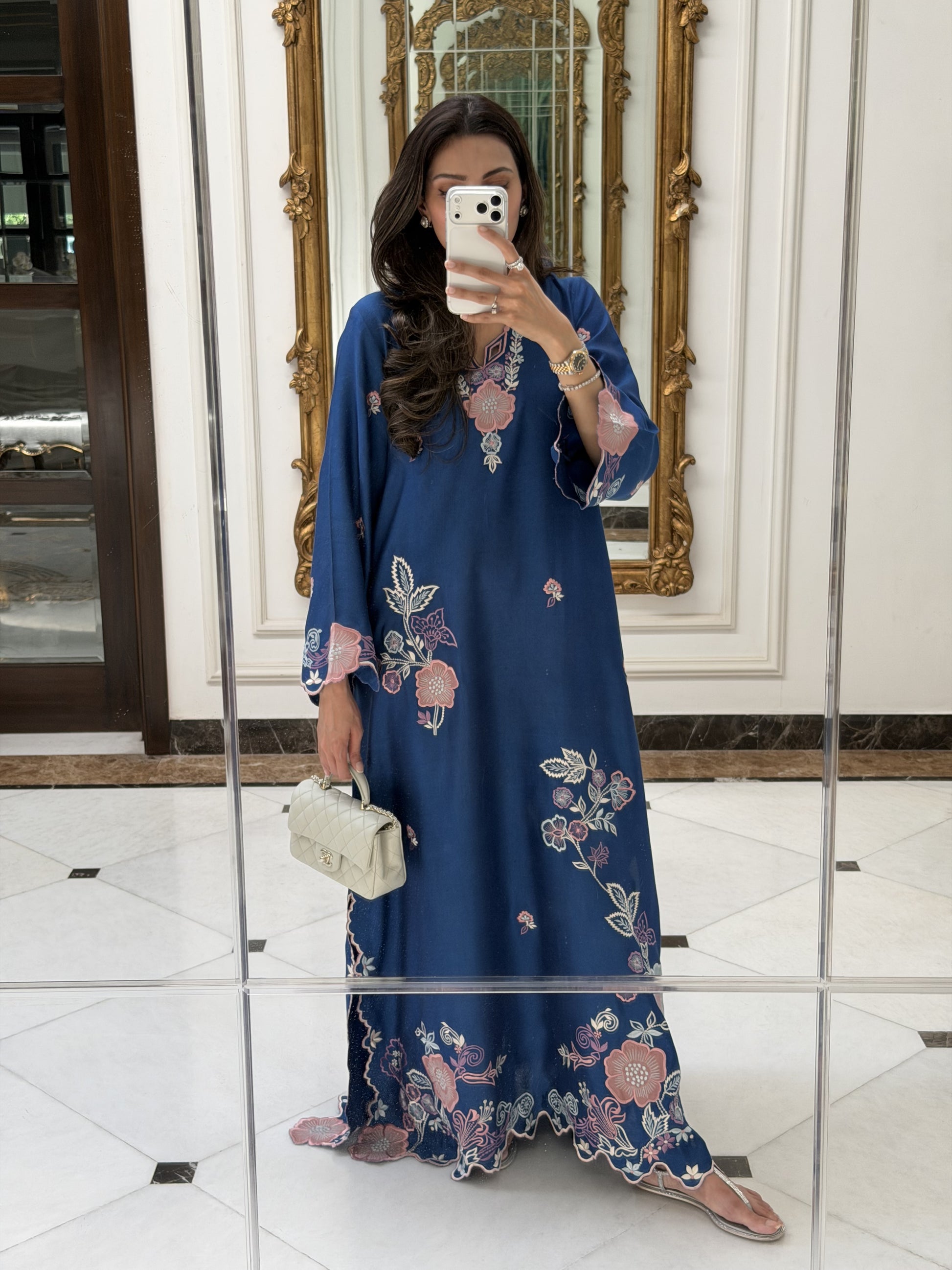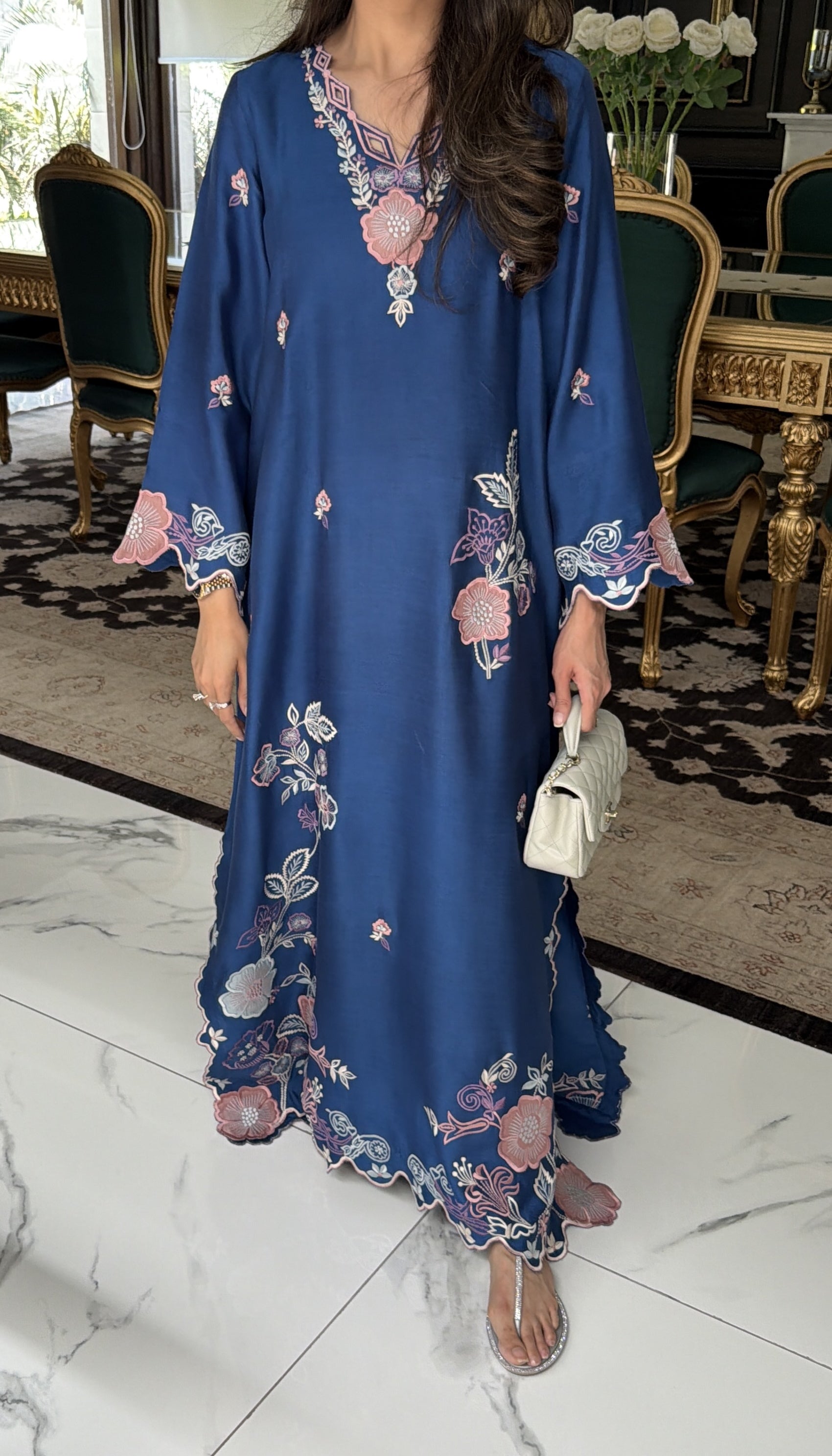 A deep blue Khadi silk kaaftan is detailed with vibrant coloured embroidery and intricate appliqué. A flowy. silhouette, traditional yet modern perfect for making a statement.