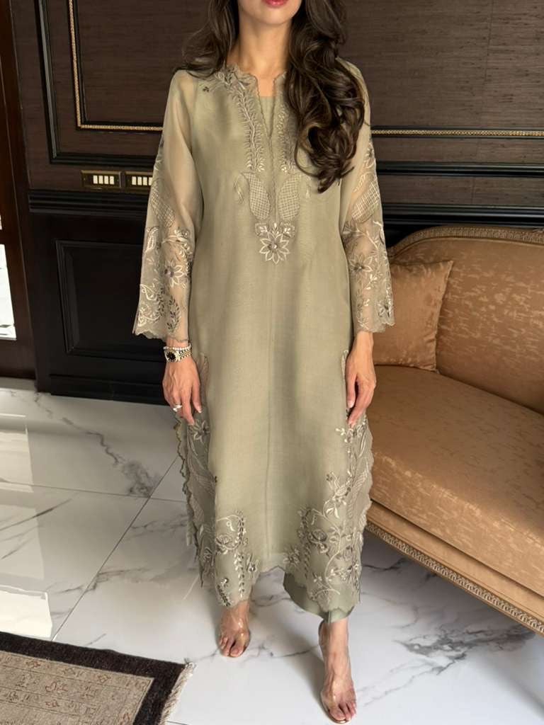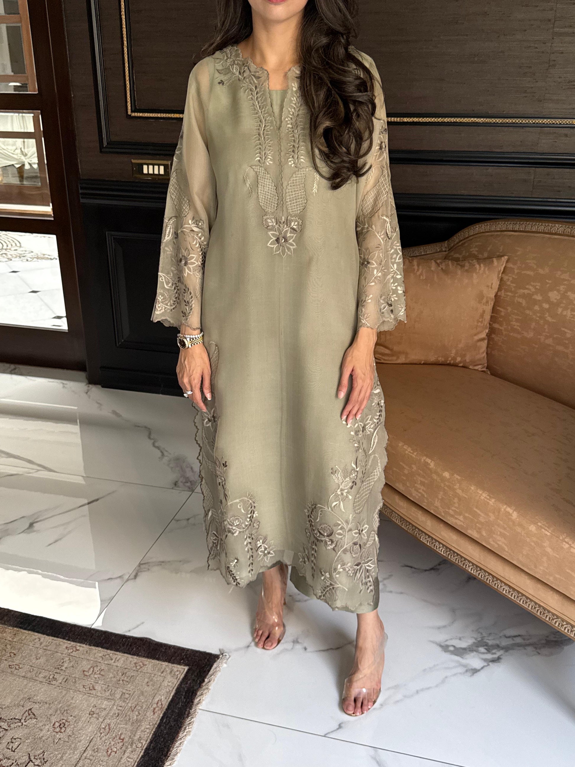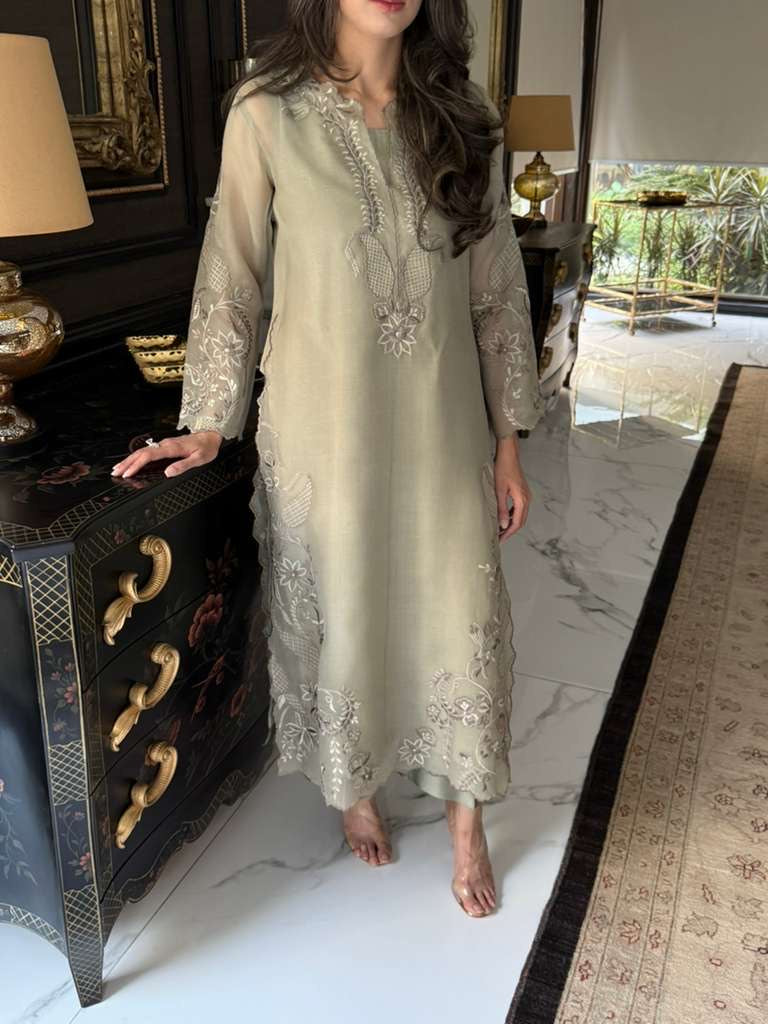 The Stunning Ice Mist, Organza Kurta with intricate embroidery in number of different shades of Green, perfect for any formal lunch or dinner, elevate it with diamonds and emeralds and you are ready as a wedding guest.