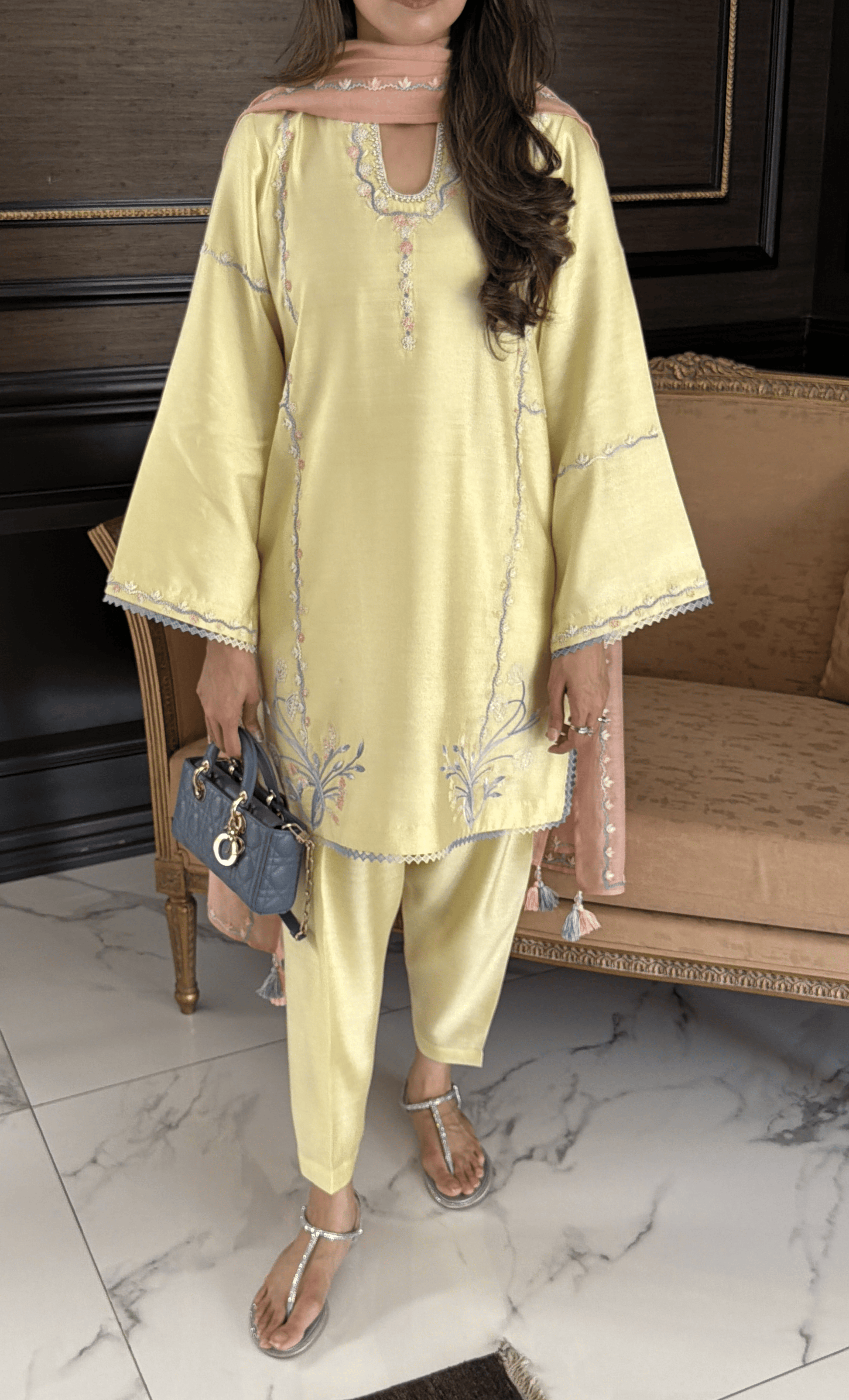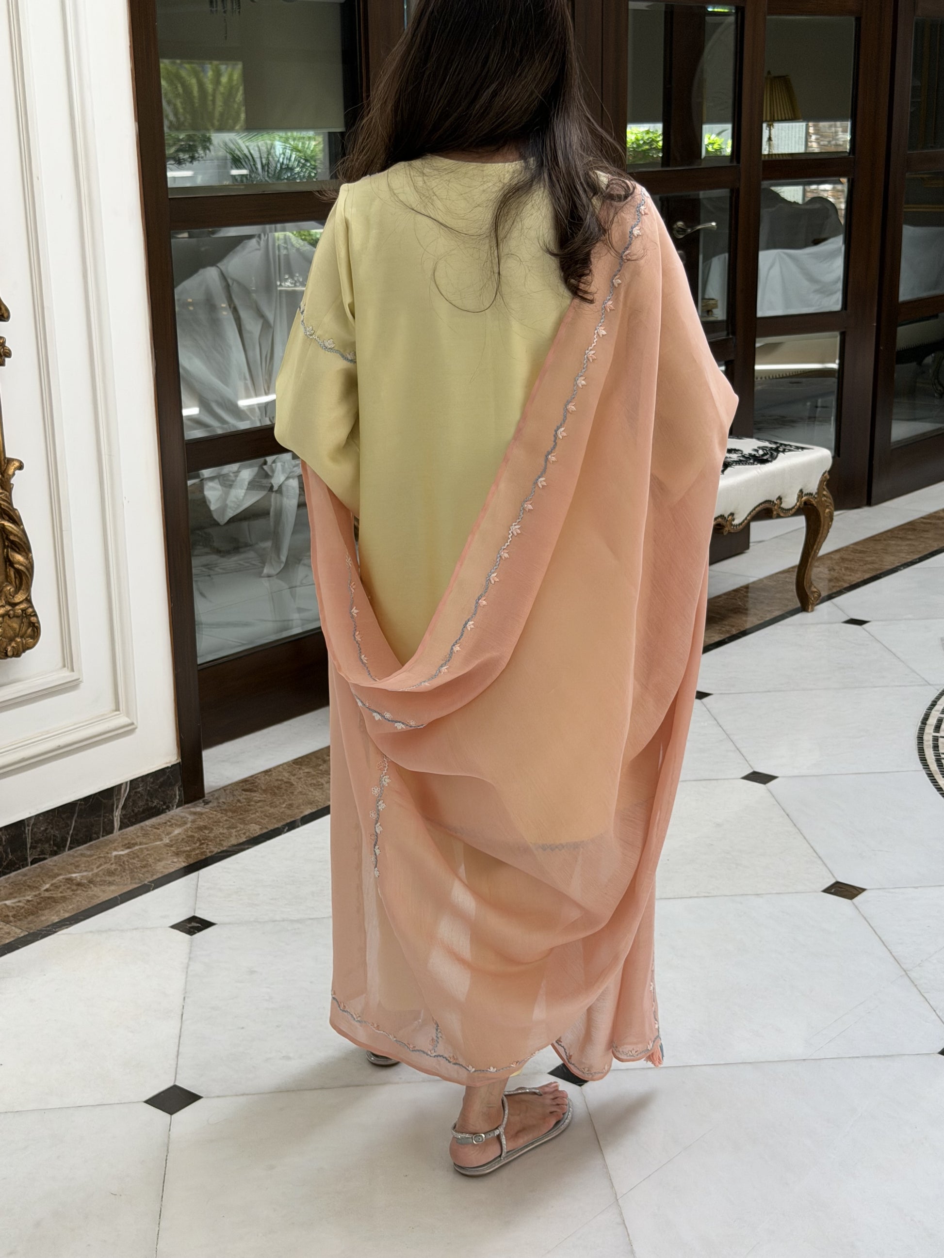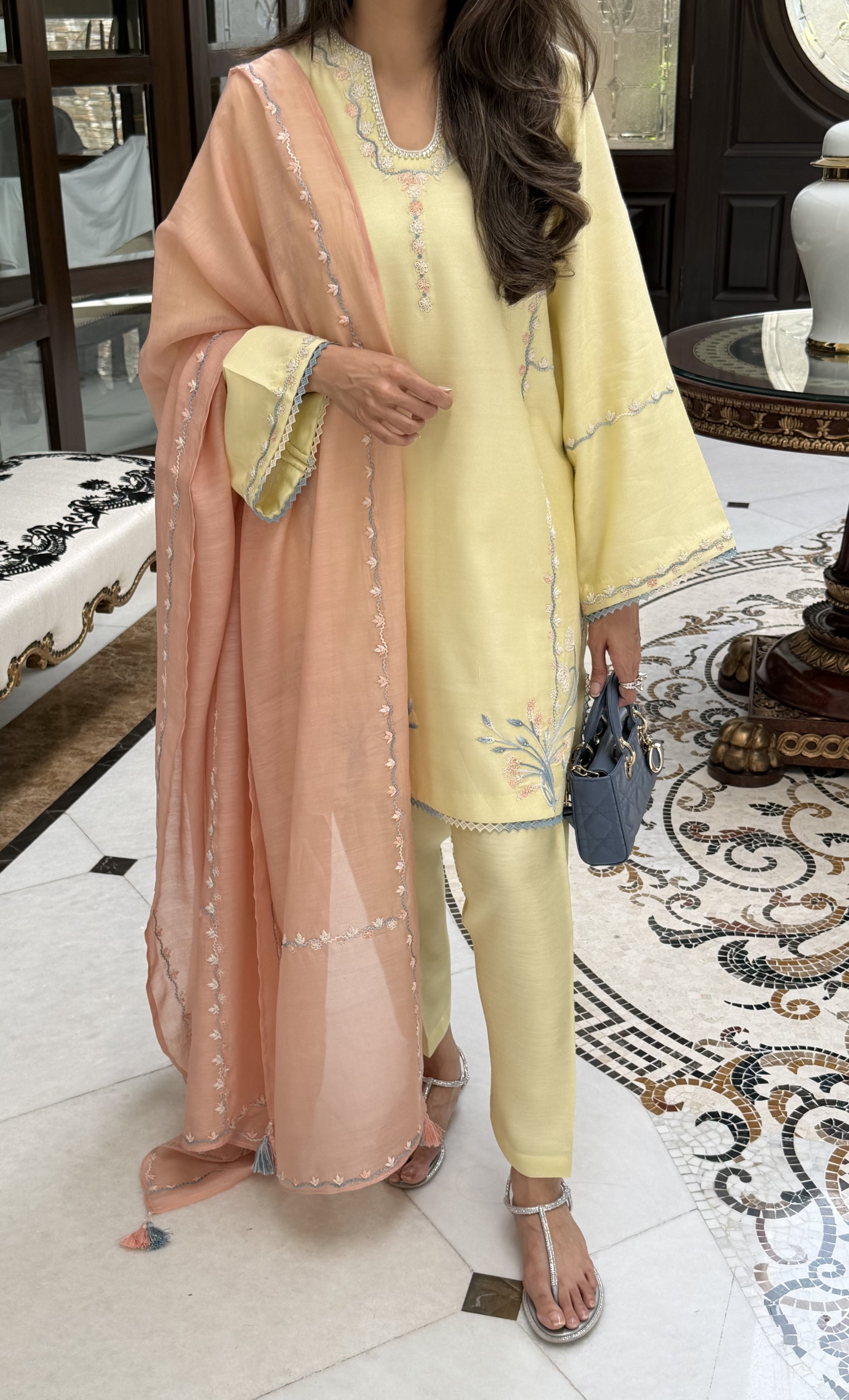 A stunning light yellow hand embroidered cotton net kurta embellished with pearls and Swarovskis encrusted neckline paired with a hand embroidered kora cotton duppata in soft shade of peach delicately finished with tassles.