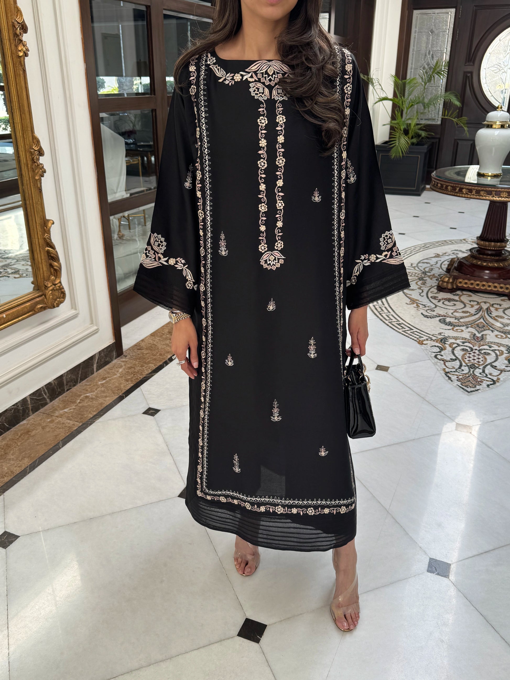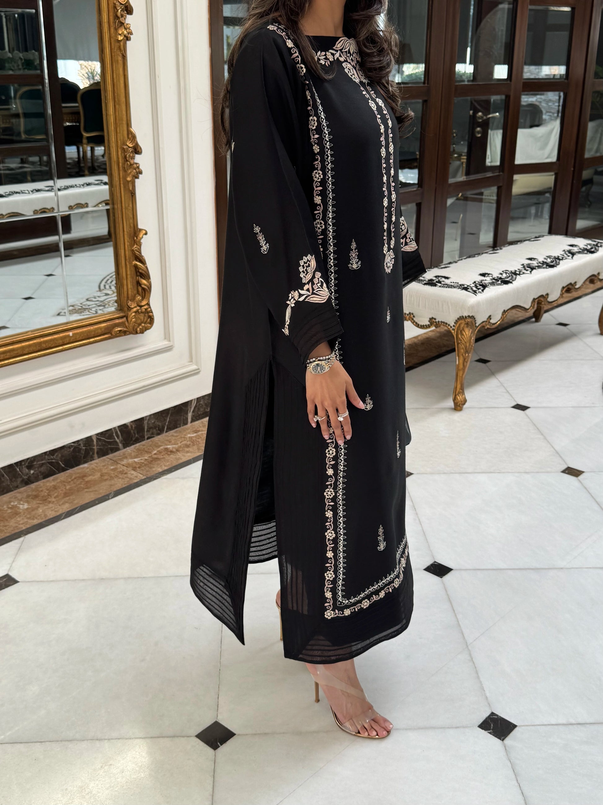 A stunning ivory Khadi Silk kurta delicately embroidered in shades of berry red,pink, sage green and beige. Hems and sides perfectly detailed with pleated organza, elevating the look to another level. Kurta is seen here paired with an organza pleated detailed pants.