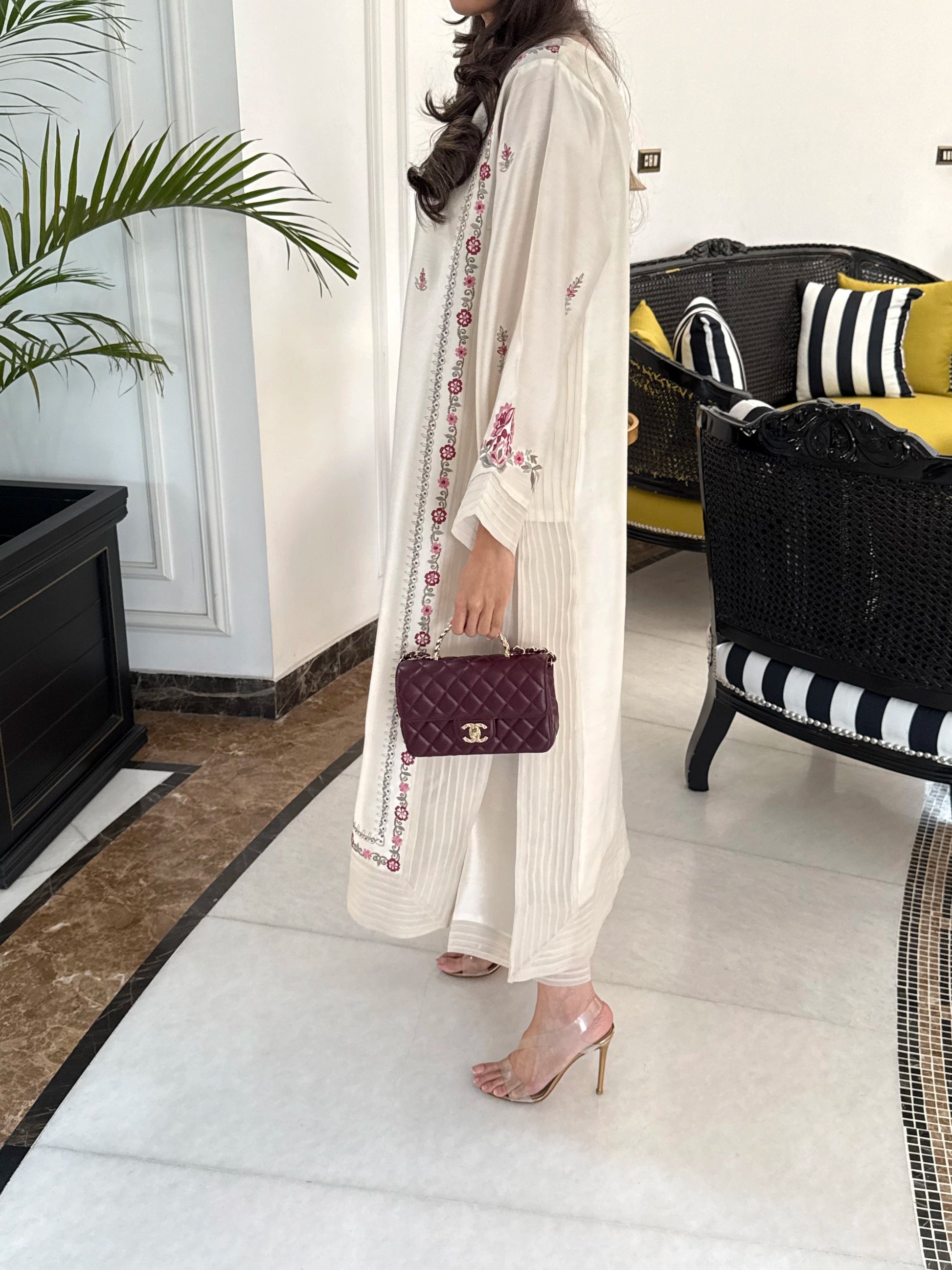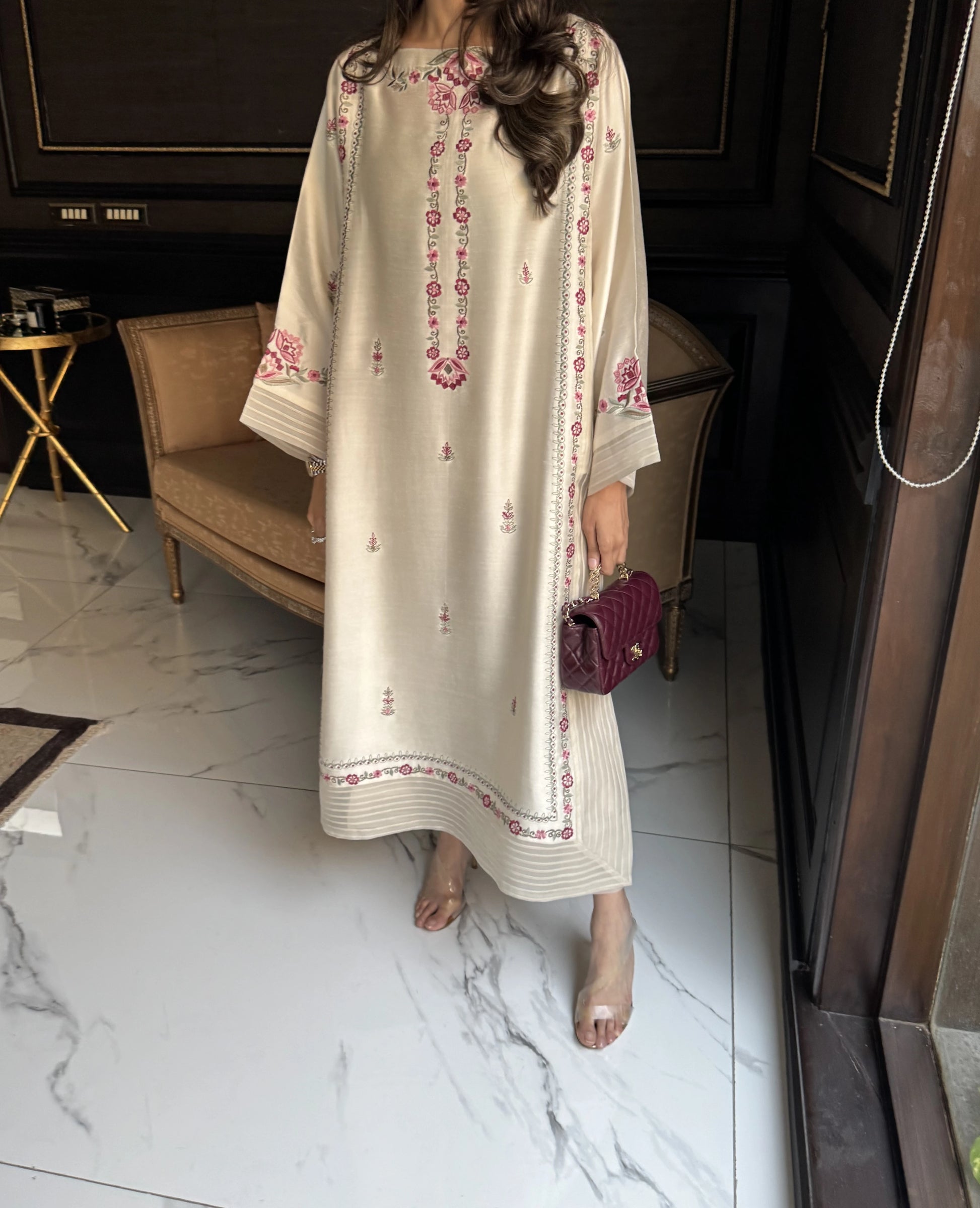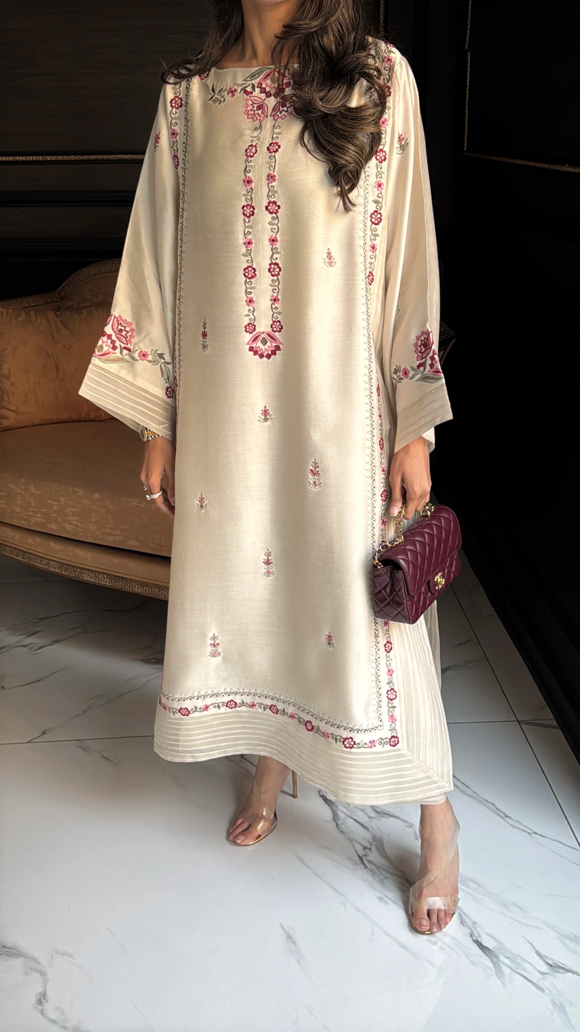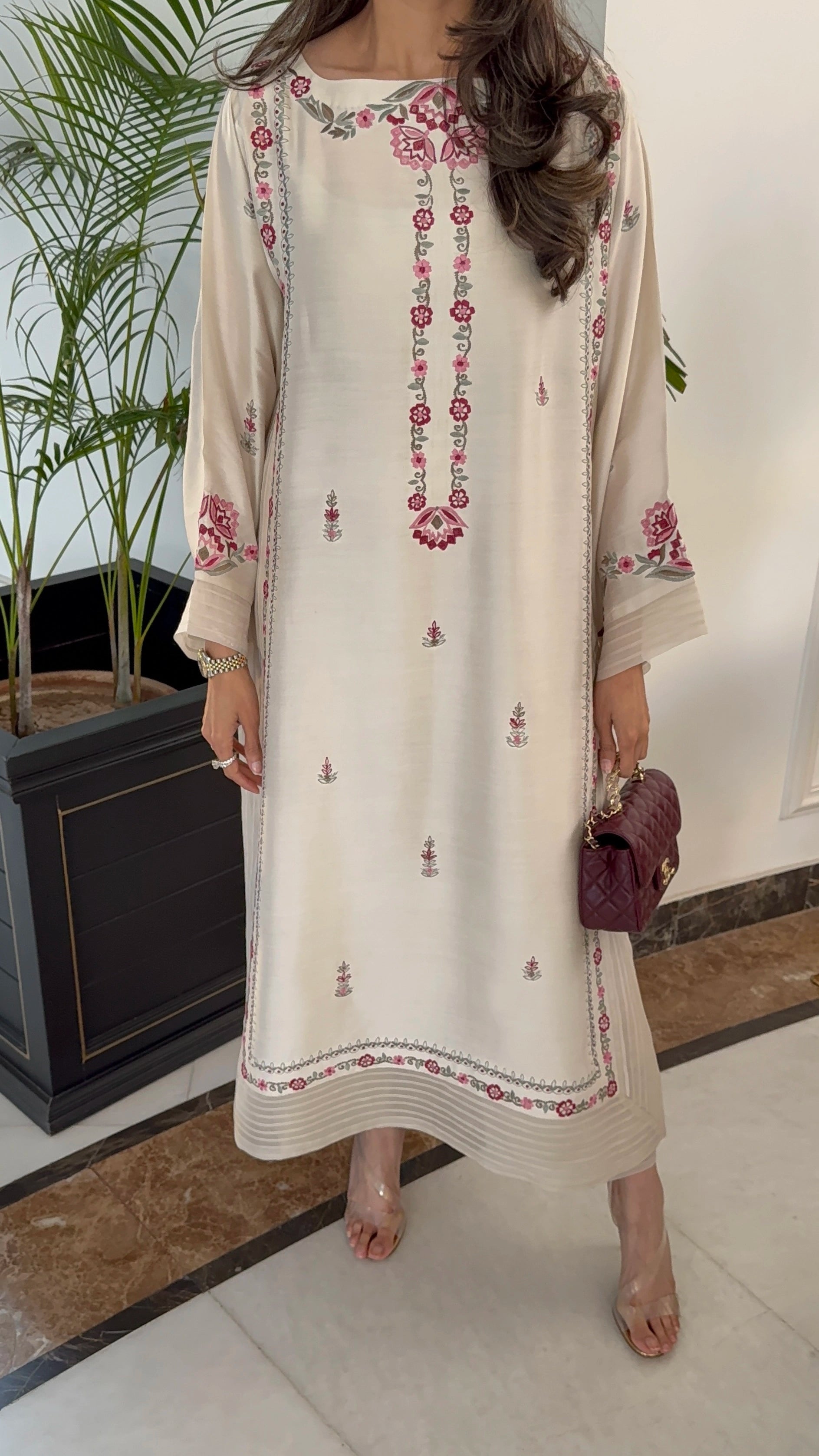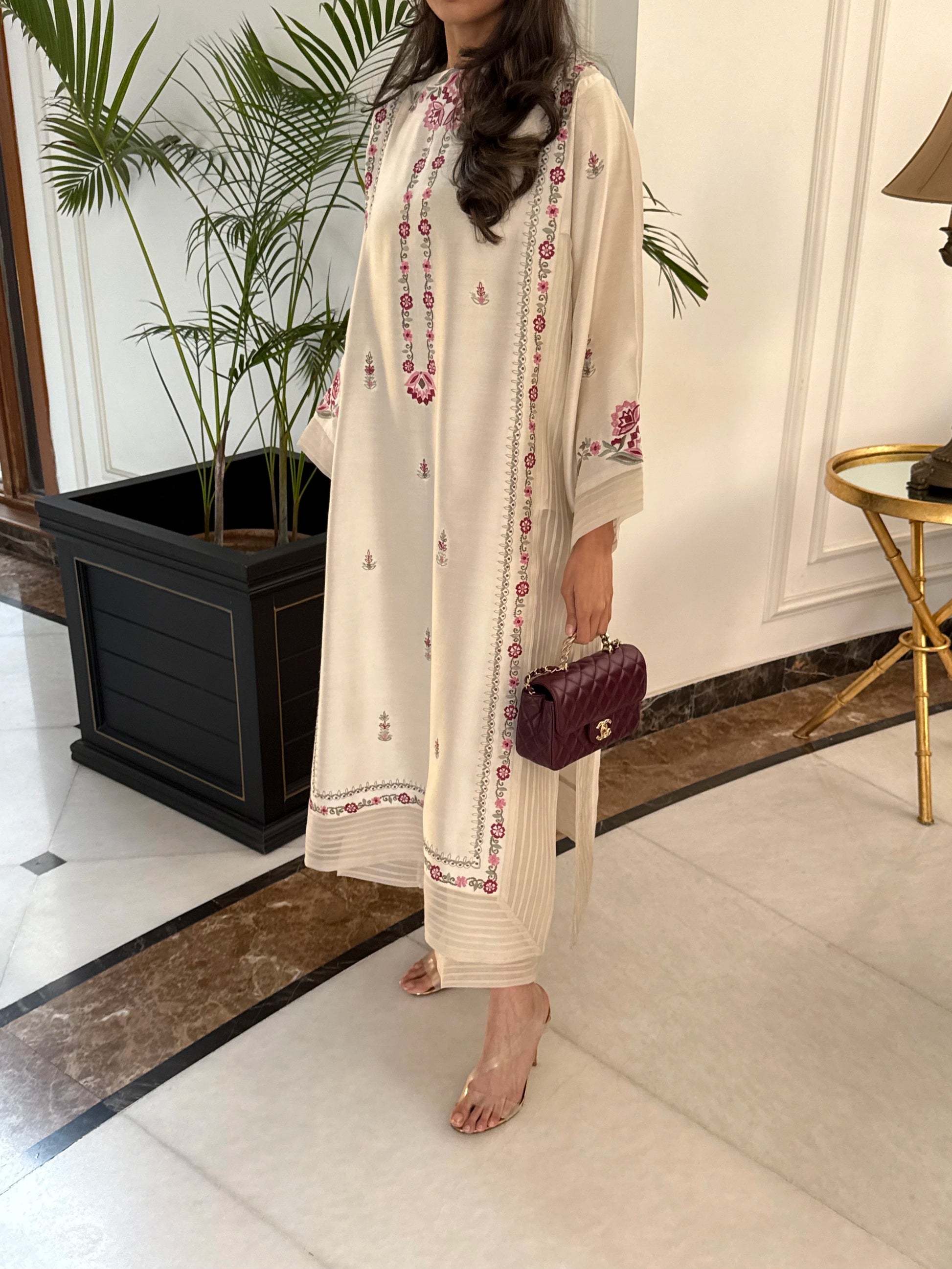 A stunning ivory Khadi Silk kurta delicately embroidered in shades of berry red,pink, sage green and beige. Hems and sides perfectly detailed with pleated organza, elevating the look to another level. Kurta is seen here paired with an organza pleated detailed pants.