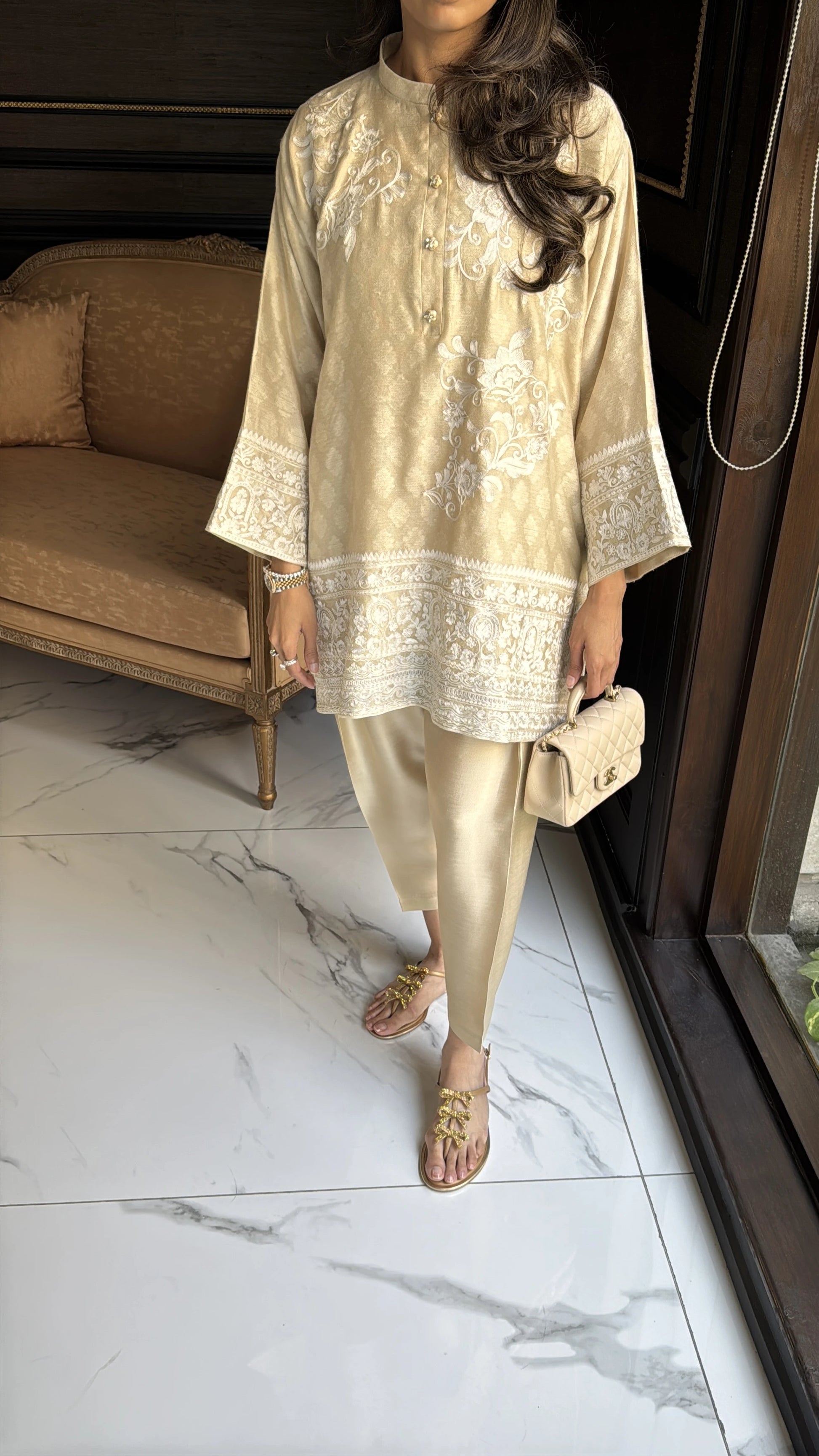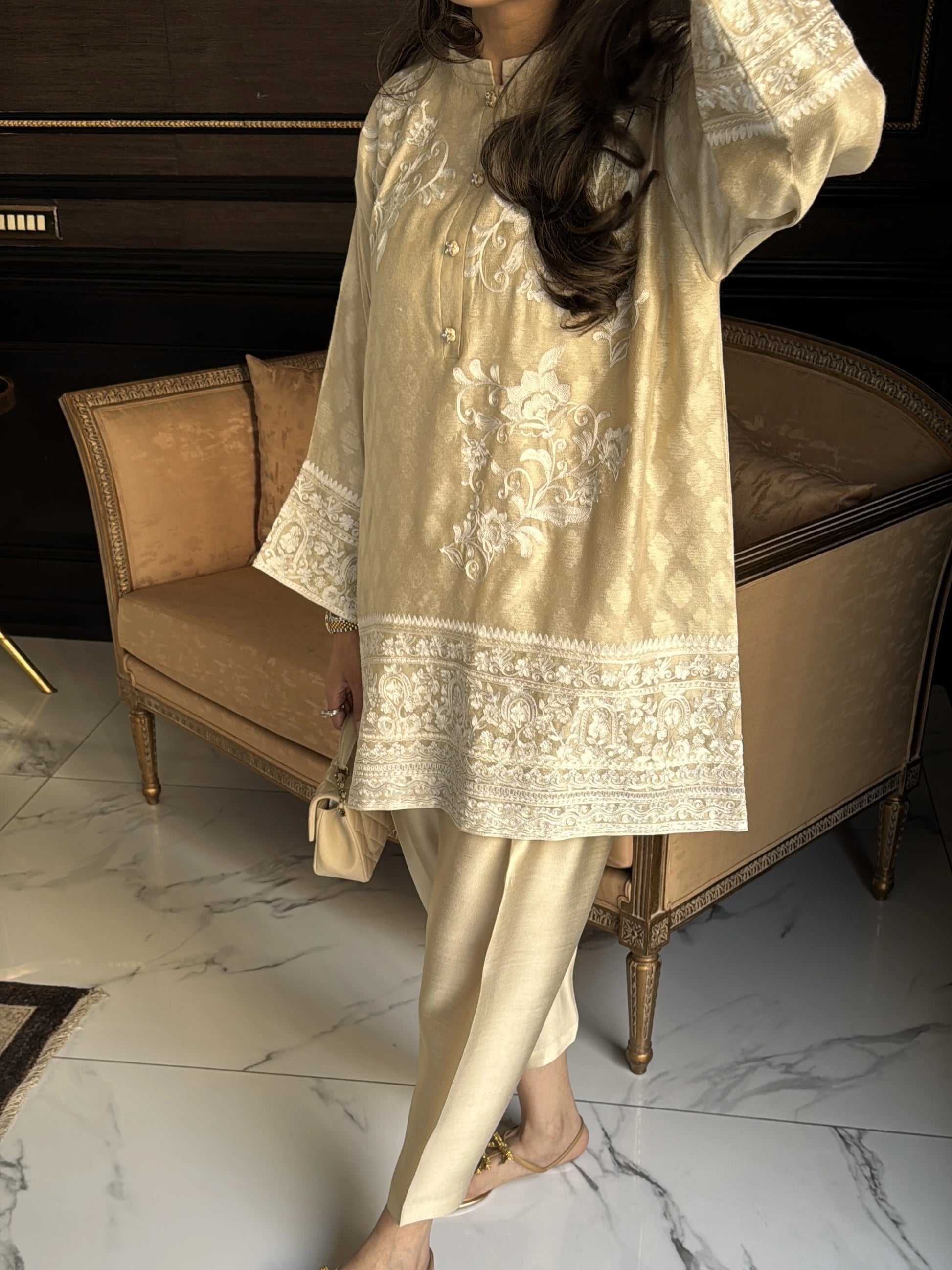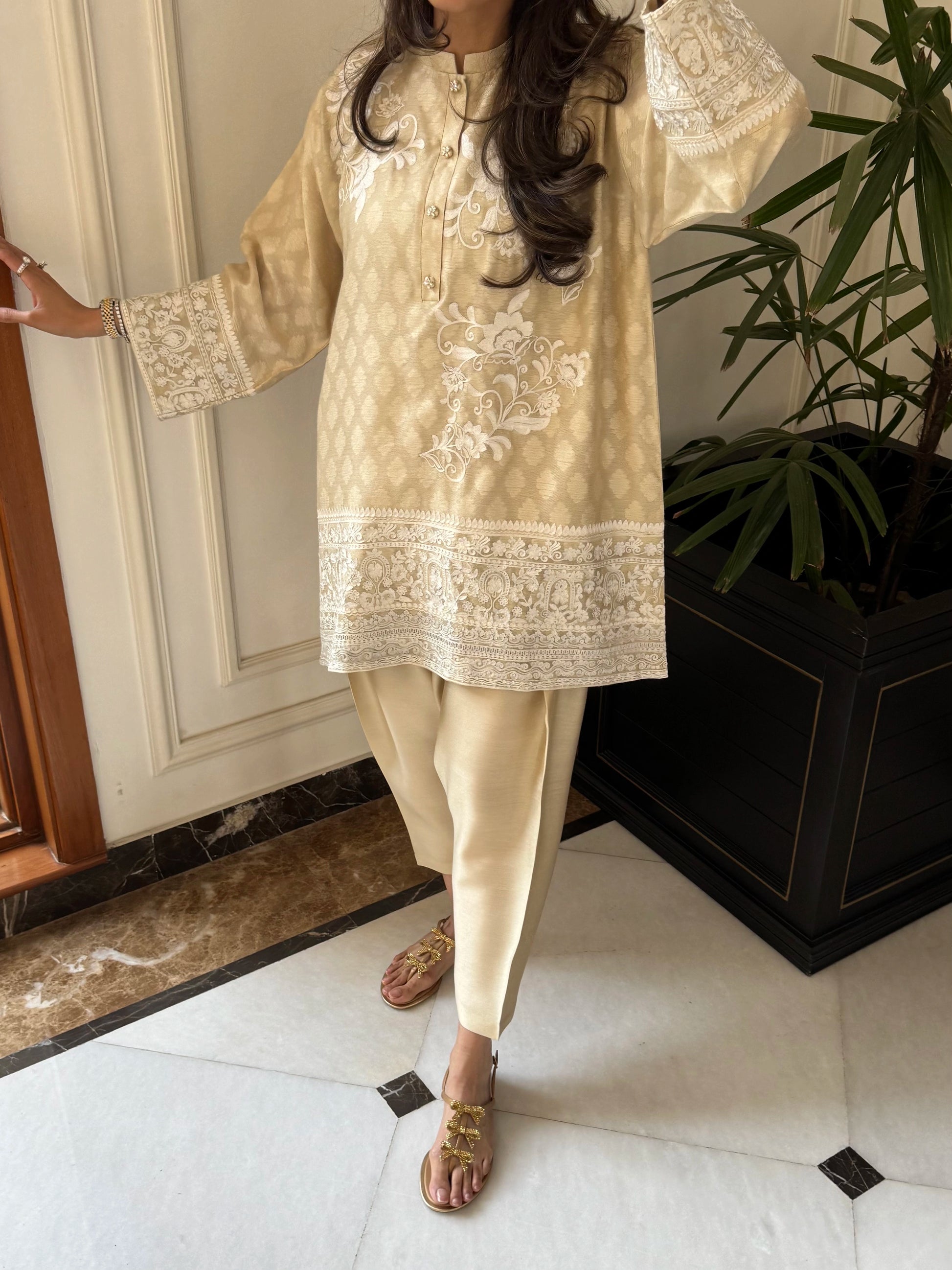 A pure self cotton net, boxy cut fully lined kurta in pearl yellow colour. Defined with aari embroidery and perfectly detailed with jewelled buttons. It’s paired with a viscose silk skinny shalwar. Beautiful feminine silhouette to make you stand out
