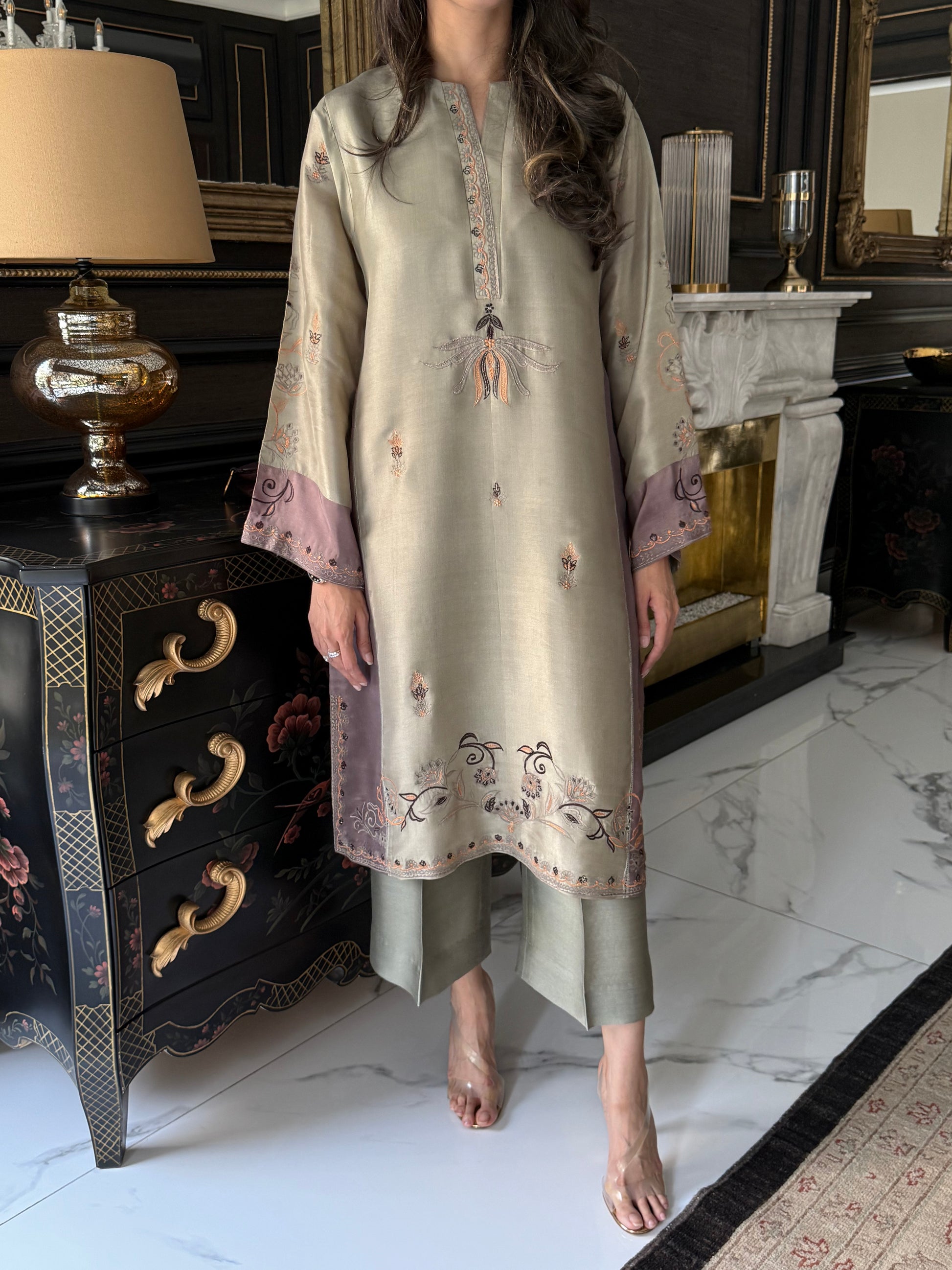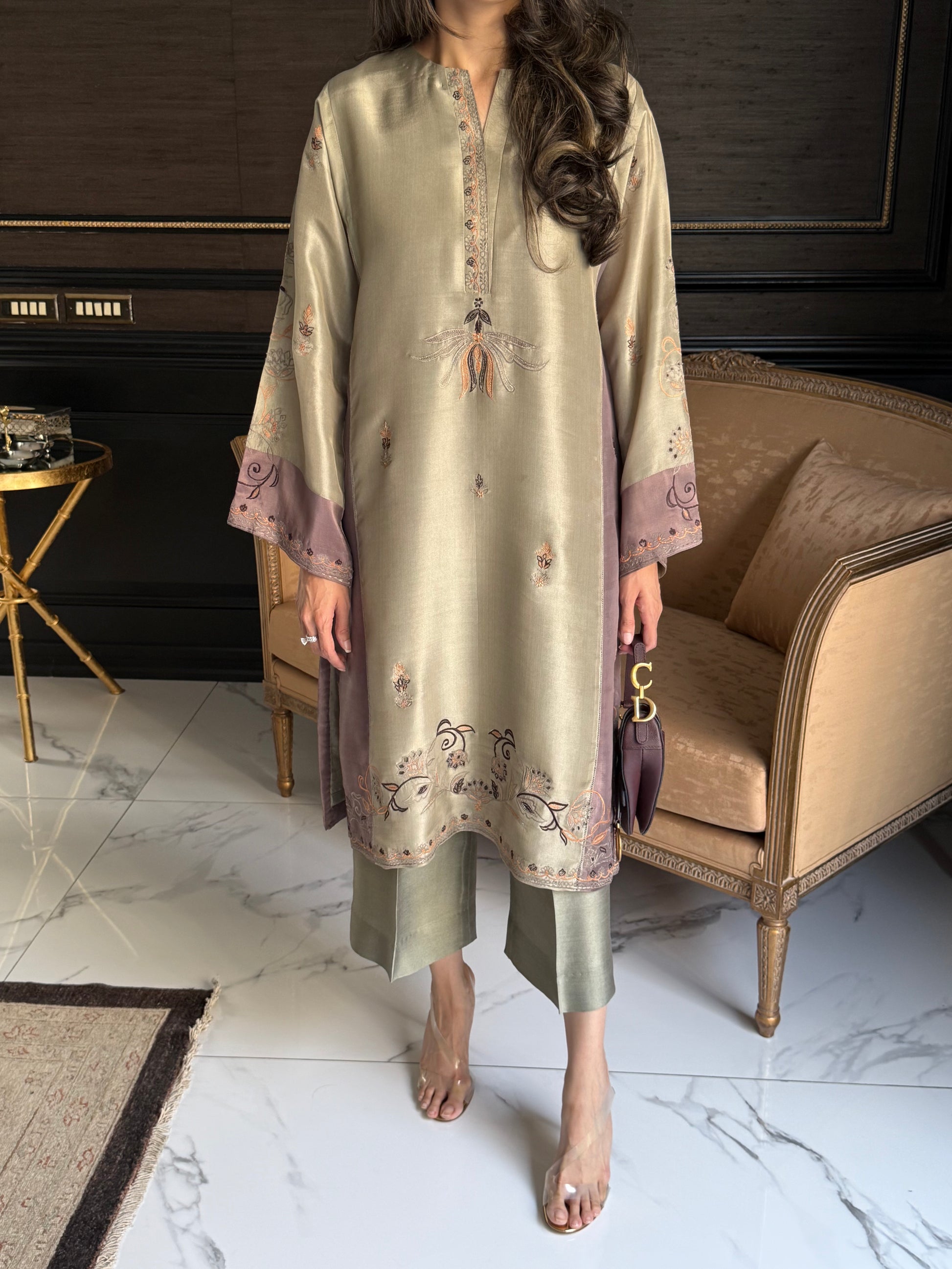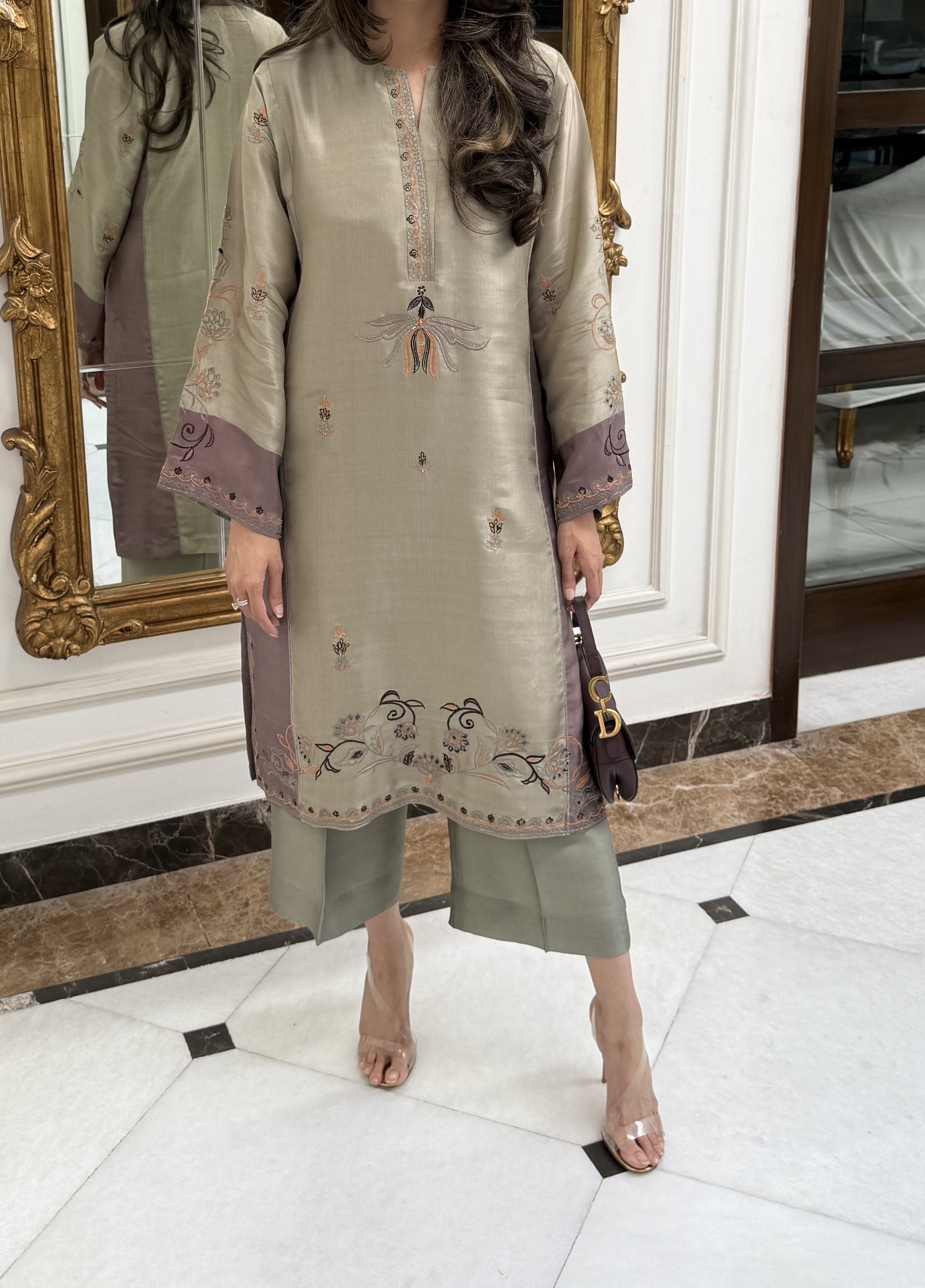 This soft Sage and Mauve on Khaadi Silk, embroidered ensemble from our Pret Wear Collection is perfect for refined everyday elegance - adorned with delicate threadwork and subtle contrasts for a graceful finish.