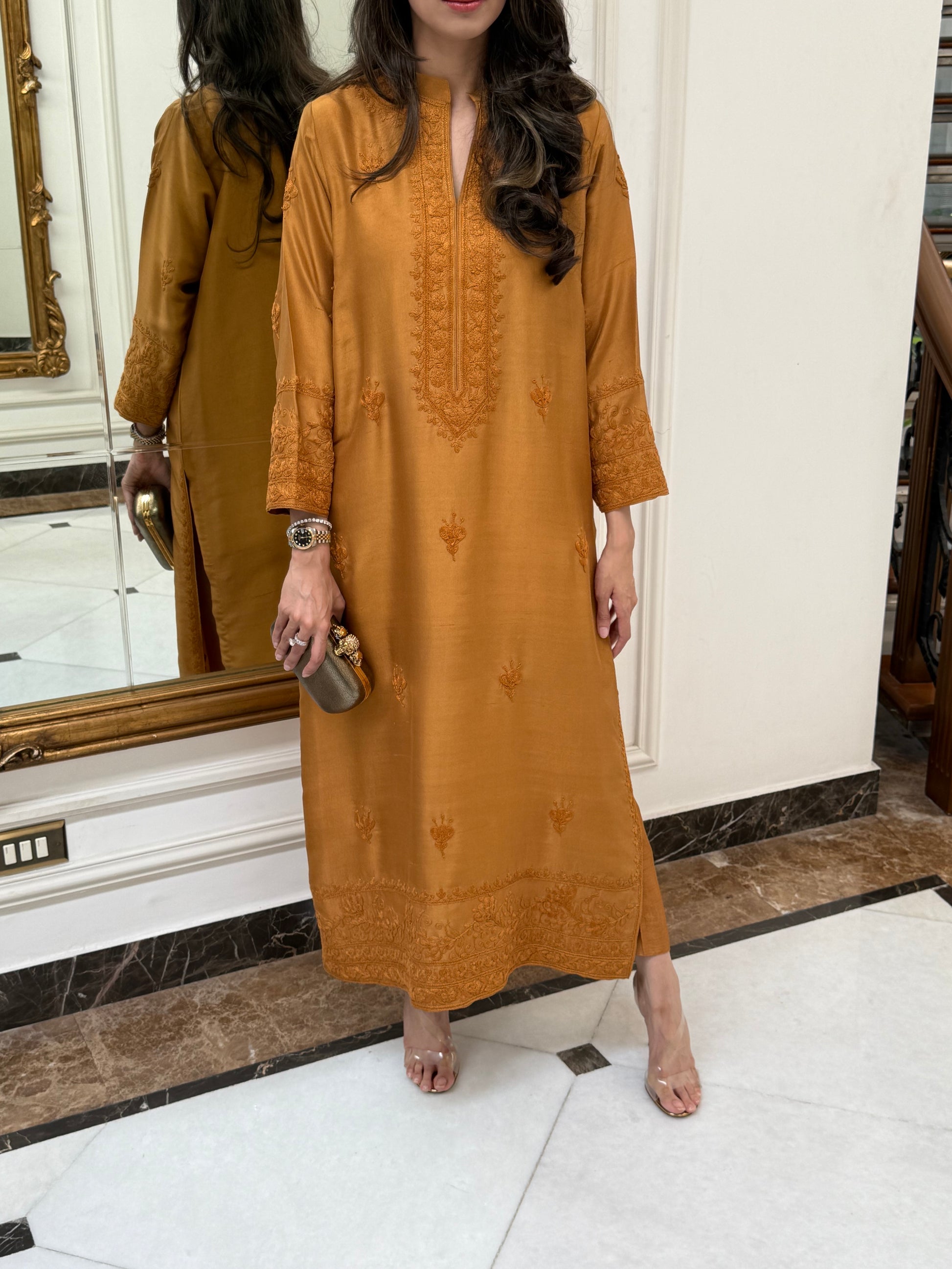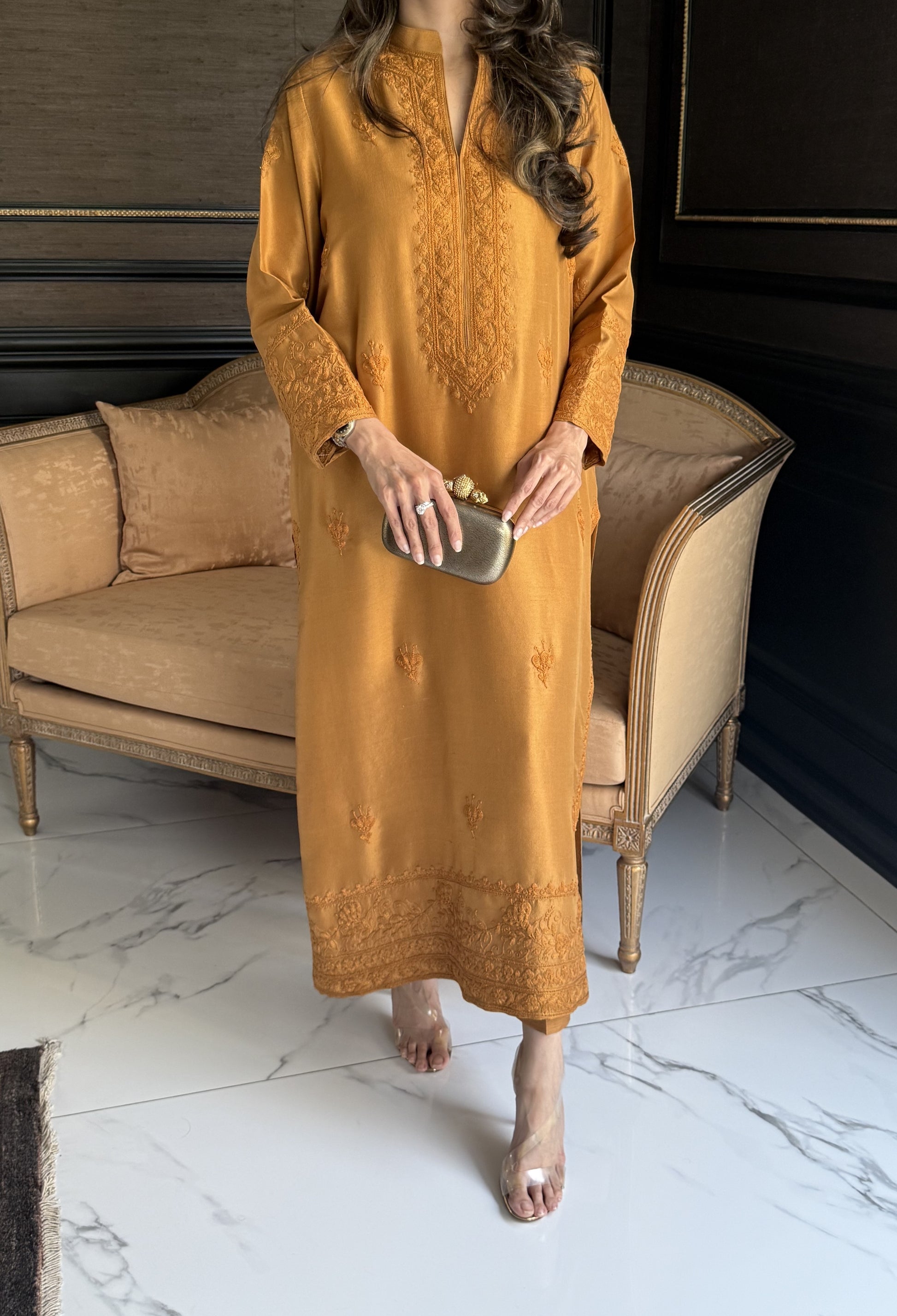The Saffron exudes timeless elegance with its rich texture and intricate embroidery. The lustrous Raw Silk Fabric adds a luxurious sheen, while the detailed embroidery enhances its sophistication. Perfect for festive occasions or formal gathers, this piece strikes the ideal balance between tradition and modern grace - a statement of refined style and effortless charm.